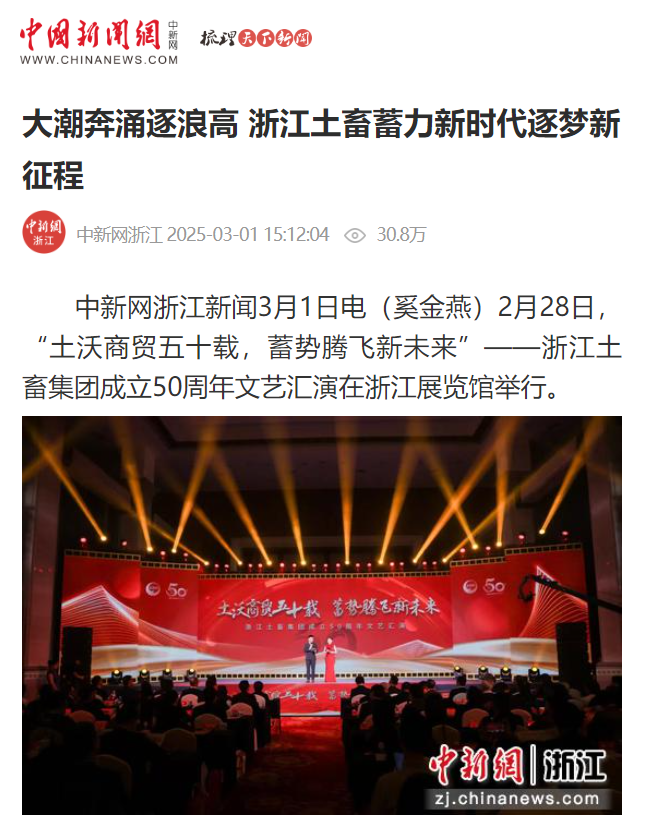 2月28日,浙江省土產(chǎn)畜產(chǎn)進(jìn)出口集團(tuán)有限公司(浙江土畜集團(tuán))在浙江展覽館舉行公司成立五十周年文藝匯演。本次文藝匯演以“土沃商貿(mào)五十載,蓄勢(shì)騰飛新未來”為主題,以“沃土育初心”、“跨越五十載”和“蓄力新時(shí)代”為三個(gè)篇章,邀請(qǐng)了中國食品土畜進(jìn)出口商會(huì)、中國紡織品進(jìn)出口商會(huì)、浙江省商務(wù)廳、浙江省農(nóng)業(yè)農(nóng)村廳、杭州市拱墅區(qū)人民政府、浙江省國貿(mào)集團(tuán)、天水街道領(lǐng)導(dǎo)及公司職工代表共計(jì)百余人參加活動(dòng)。浙江日?qǐng)?bào)、中新社浙江分社、潮新聞、人民號(hào)、浙江國資、浙江融媒體和今日頭條等媒體報(bào)道、轉(zhuǎn)發(fā),全網(wǎng)總閱讀量逾百萬。