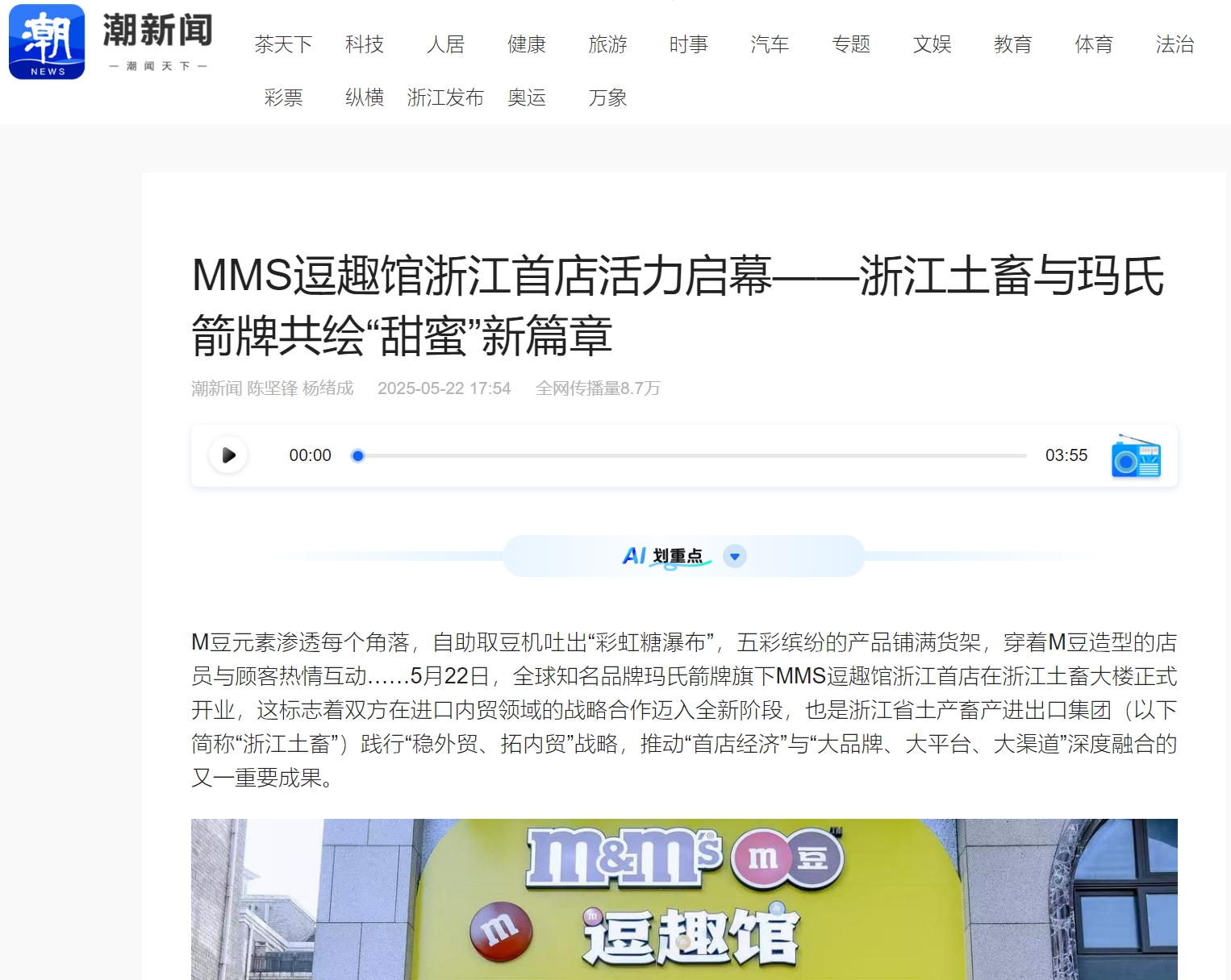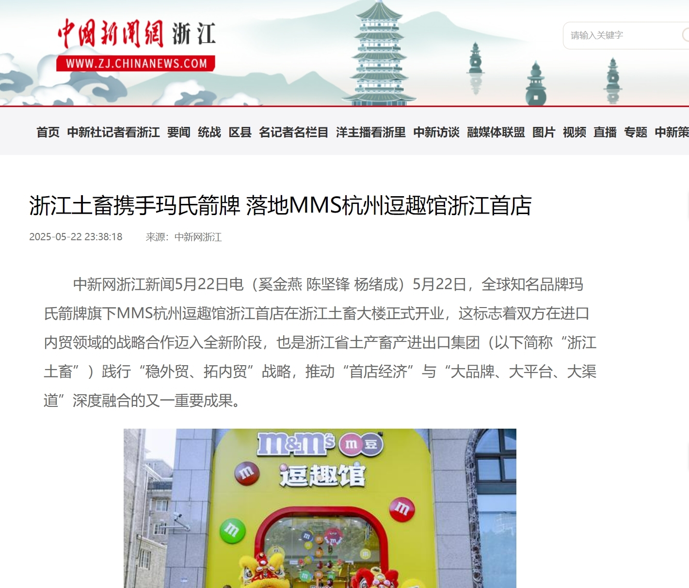 5月22日,全球知名品牌瑪氏箭牌旗下MMS逗趣館浙江首店在浙江土畜大樓正式開業(yè),這標志著雙方在進口內(nèi)貿(mào)領域的戰(zhàn)略合作邁入全新階段,也是浙江省土產(chǎn)畜產(chǎn)進出口集團踐行“穩(wěn)外貿(mào)、拓內(nèi)貿(mào)”戰(zhàn)略,推動“首店經(jīng)濟”與“大品牌、大平臺、大渠道”深度融合的又一重要成果。MMS逗趣館浙江首店落地獲中新社浙江分社、潮新聞、今日長三角等多家媒體關注報道。