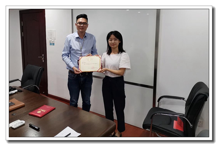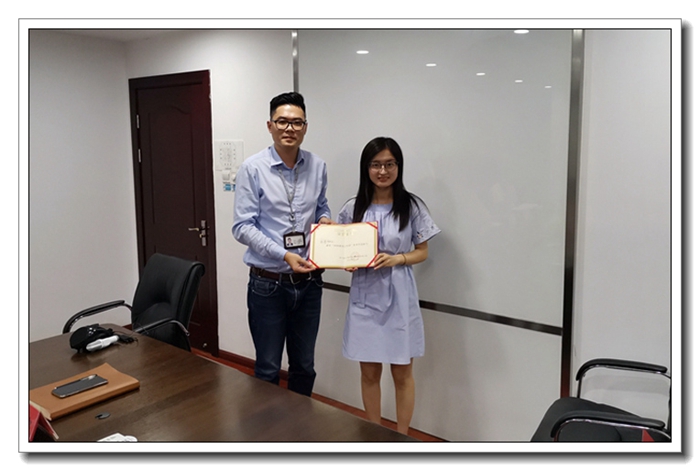 人力資源部孫陽瑯向鄭夢莎頒發(fā)優(yōu)秀學員證書