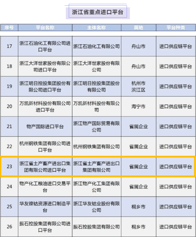 近日,浙江省商務(wù)廳公布了省進口貿(mào)易促進創(chuàng)新示范區(qū)和省重點進口平臺名單,作為國家農(nóng)業(yè)產(chǎn)業(yè)化龍頭企業(yè)和省屬大型外貿(mào)企業(yè),省土畜被評為浙江省重點進口平臺,成為浙江首批54個省級重點進口平臺之一,同時也是省國貿(mào)集團旗下唯一獲評的企業(yè)。