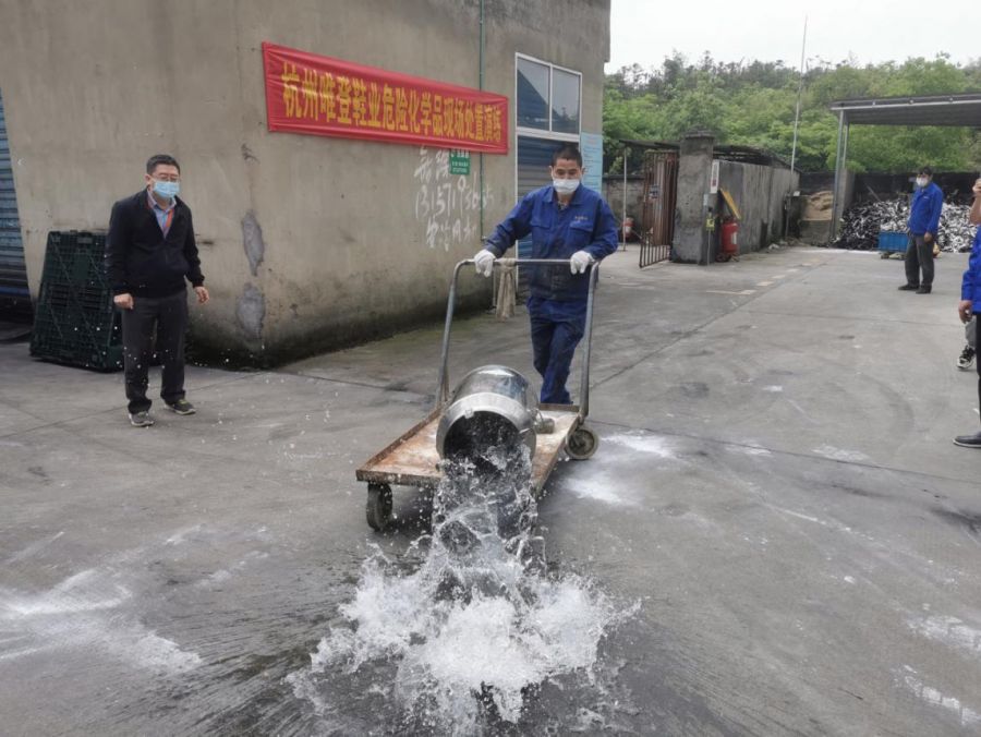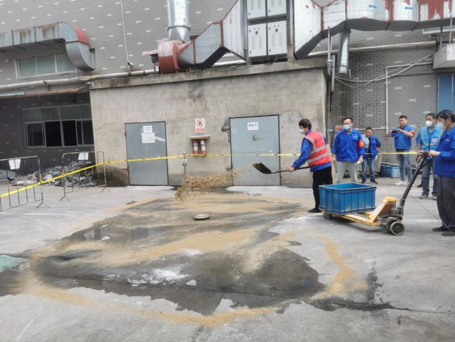 在?;沸孤┈F(xiàn)場(chǎng)處置環(huán)節(jié),企業(yè)模擬溶劑油在運(yùn)送過(guò)程中意外傾倒泄漏事故,參加演練人員準(zhǔn)確判斷風(fēng)向,安排人員疏散警戒,迅速用沙土對(duì)泄漏物進(jìn)行圍堵覆蓋,并讓作業(yè)員工及時(shí)用洗眼器對(duì)眼睛和臉頰進(jìn)行徹底清洗。